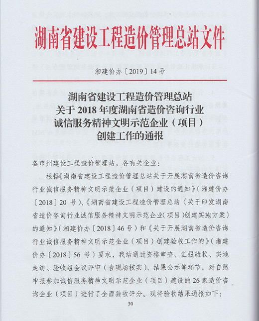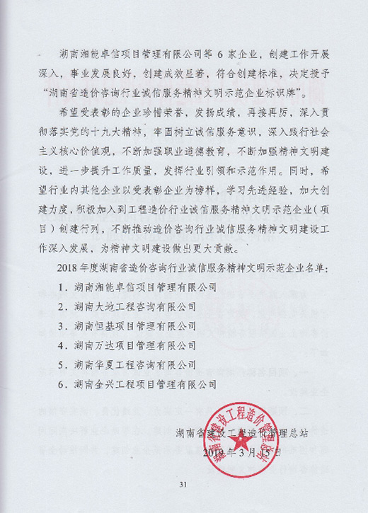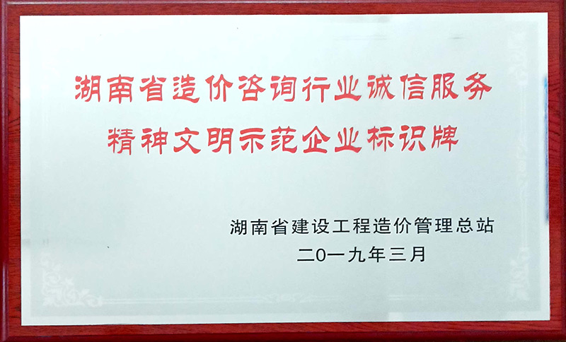 3月18日,在全省建设工程造价管理工作会议上,我司被授予“湖南省造价咨询行业诚信服务精神文明示范企业”称号。