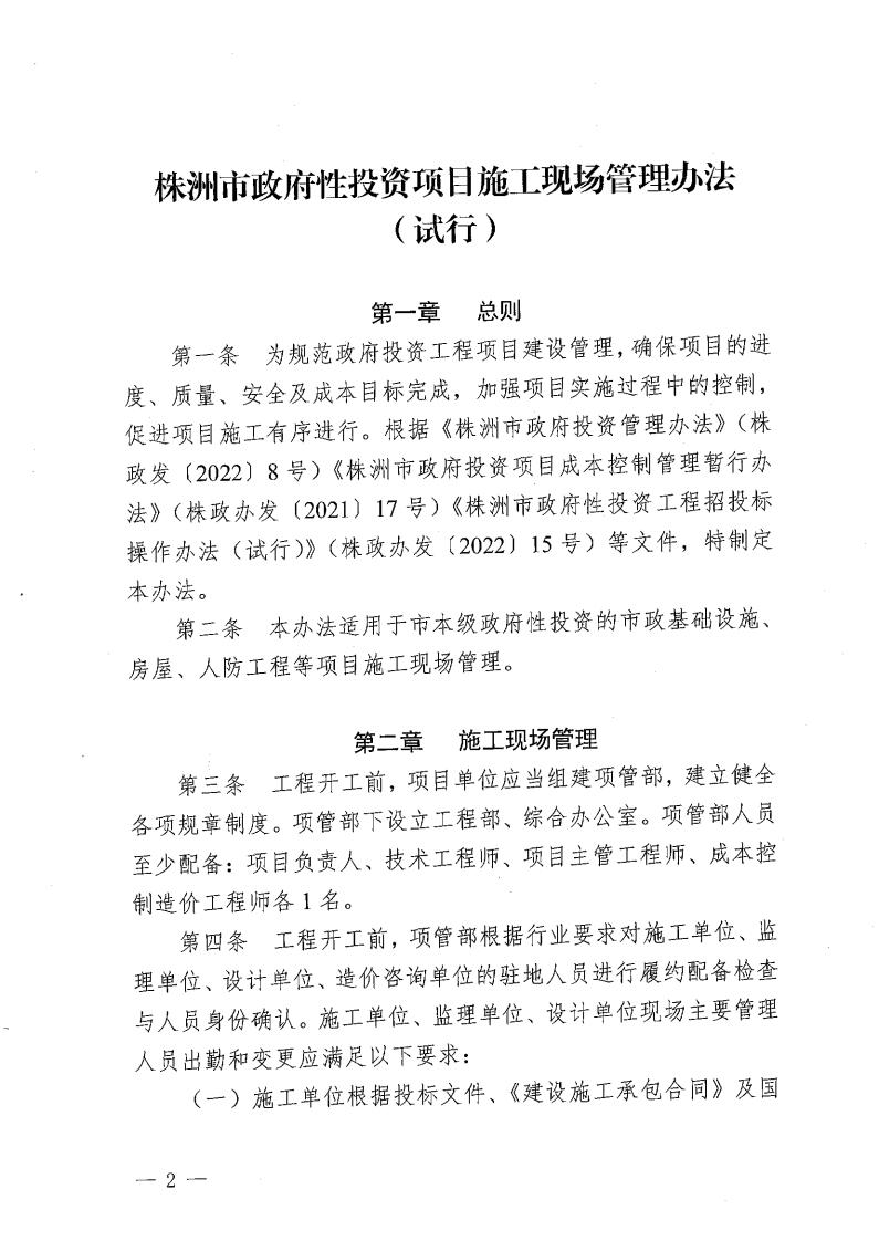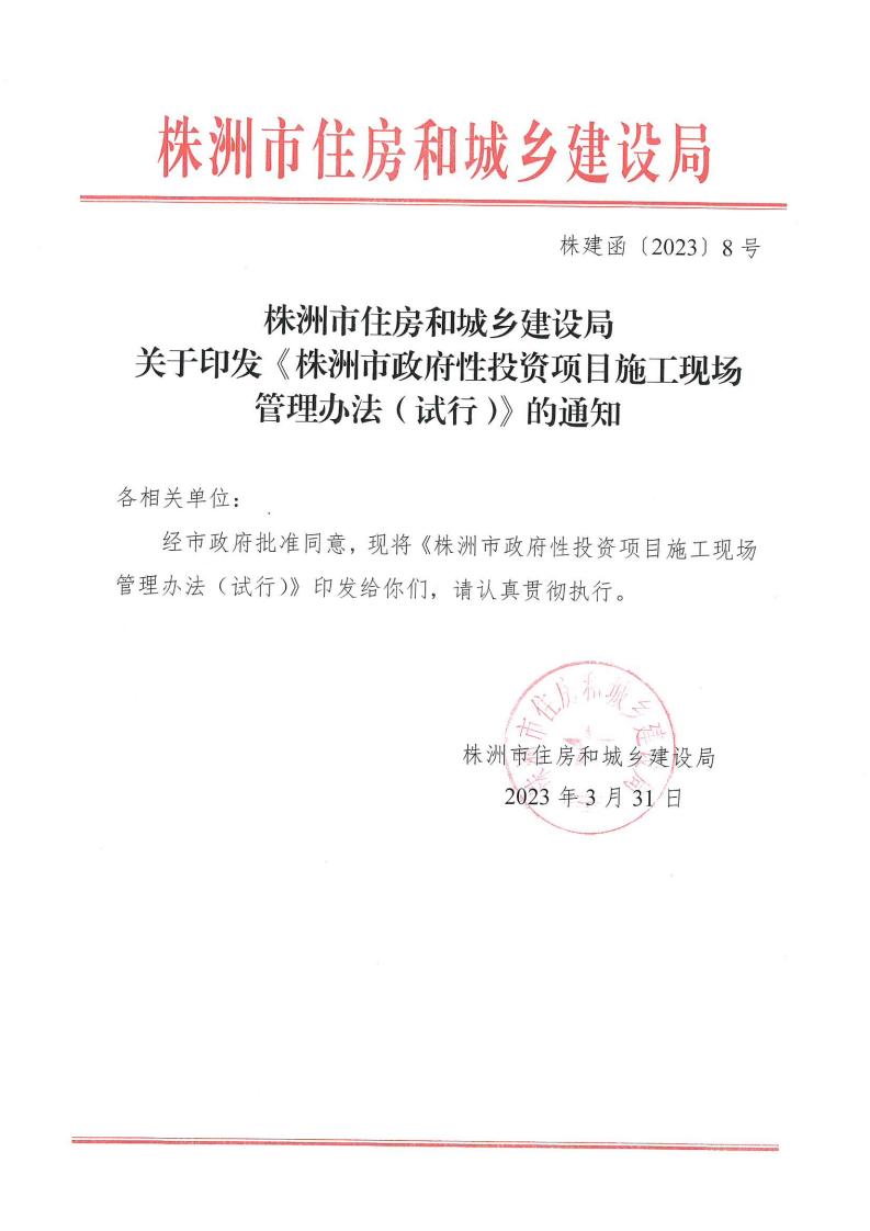 株洲市住房和城乡建设局关于印发《株洲市政府性投资项目施工现场 管理办法(试行)》的通知